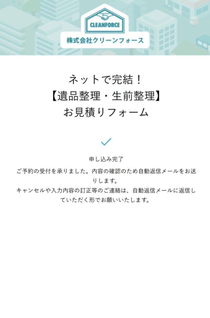 フォームの送信が完了しますとこのような表示が出ます。同時に、ご記載いただいたメールアドレスへ受付内容のメールが送信されます。