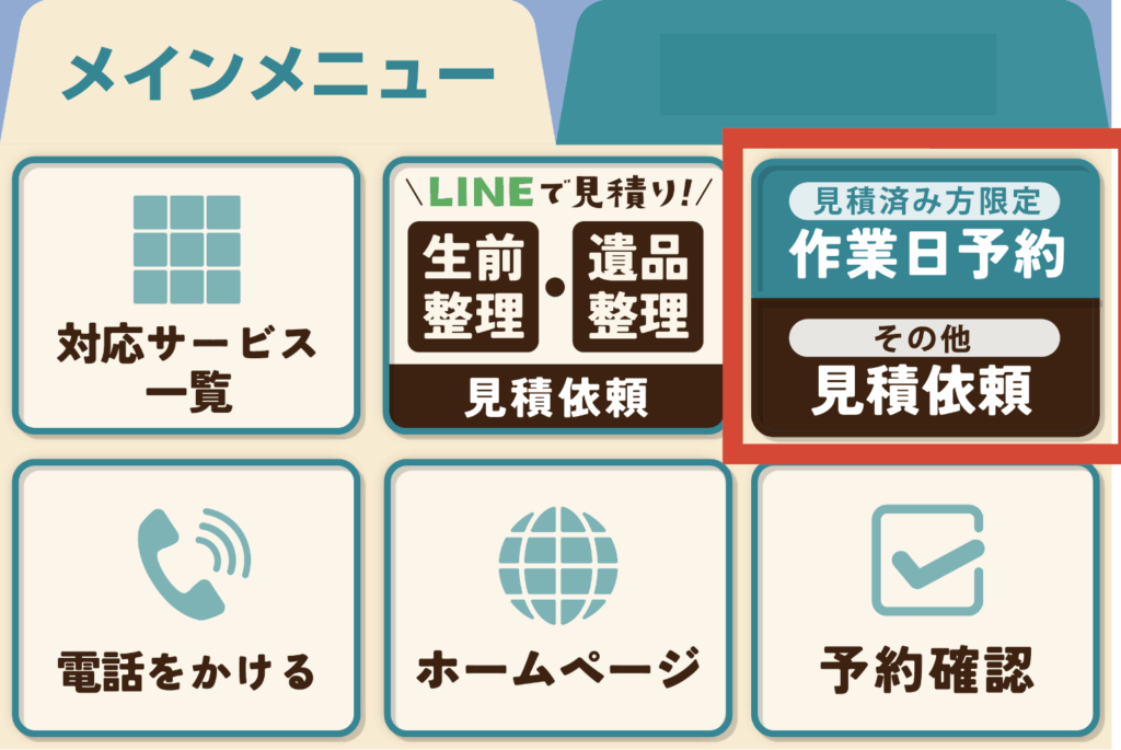 トークルーム下の『メニューをひらく』を開き、上段中央の『生前整理・遺品整理 見積依頼』を選択する。
