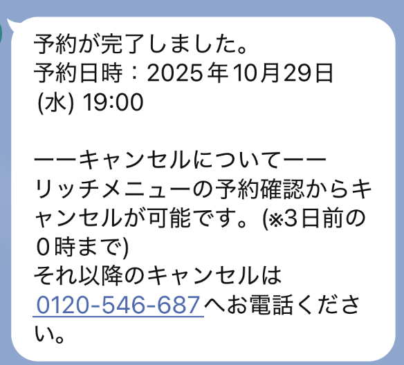 全て完了すると、トーク画面に予約完了のメッセージが届きます。