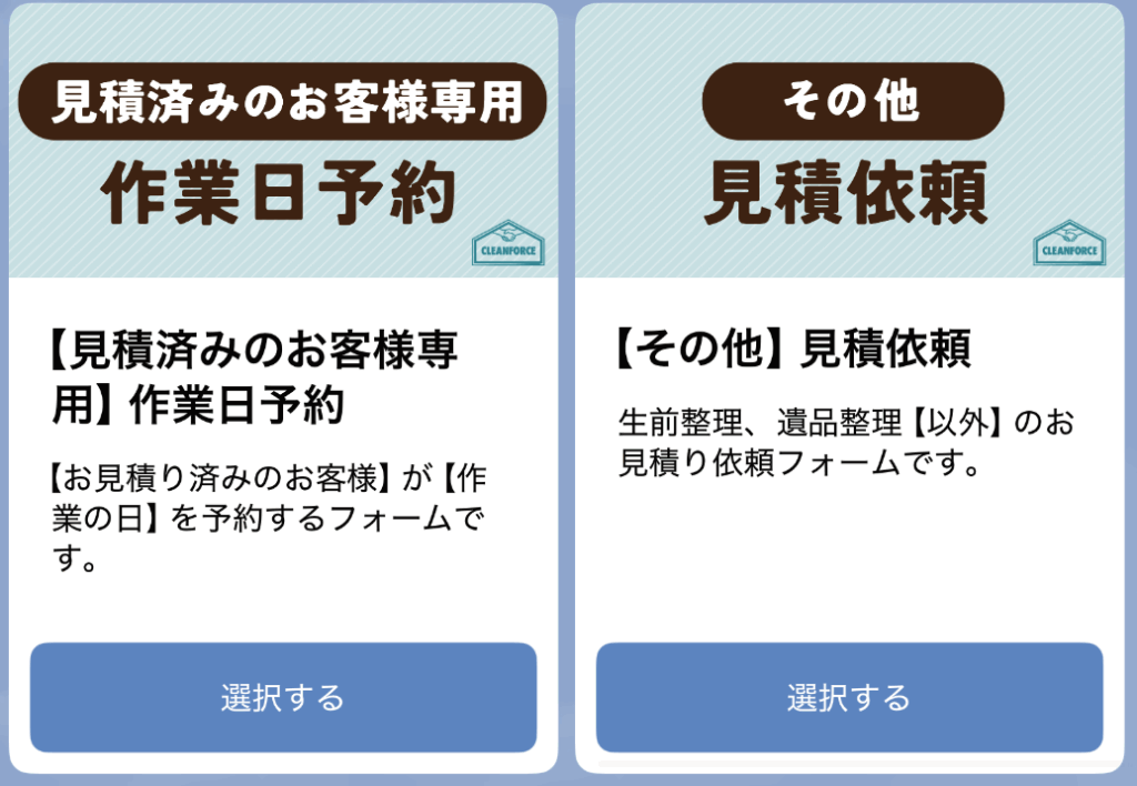トークルームに選択肢が表示されますので、『見積済みの方限定 作業日予約』を選択する。