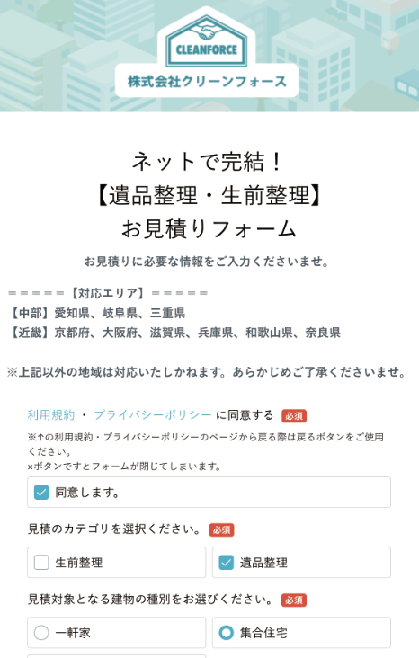フォームが表示されますので、見積に必要な情報を回答し、送信まで行ってください。